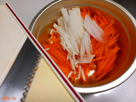 당근 많이, 무 조금을 채칼에 밀었어요.