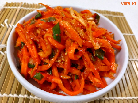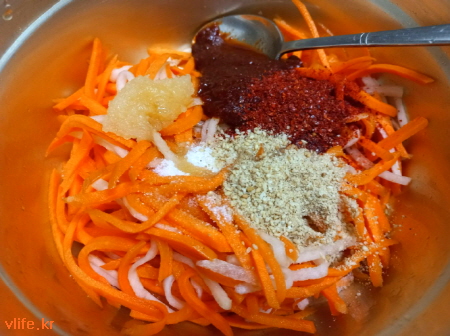 재료; 당근, 무, 파, 마늘, 고추장, 고춧가루, 설탕, 소금, 참기름, 깨소금, 파, 마늘