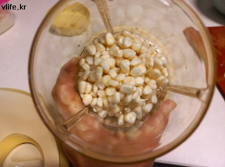 갈아질 만큼만 약간의 물을 넣고 믹서기에 옥수수를 갈았어요.